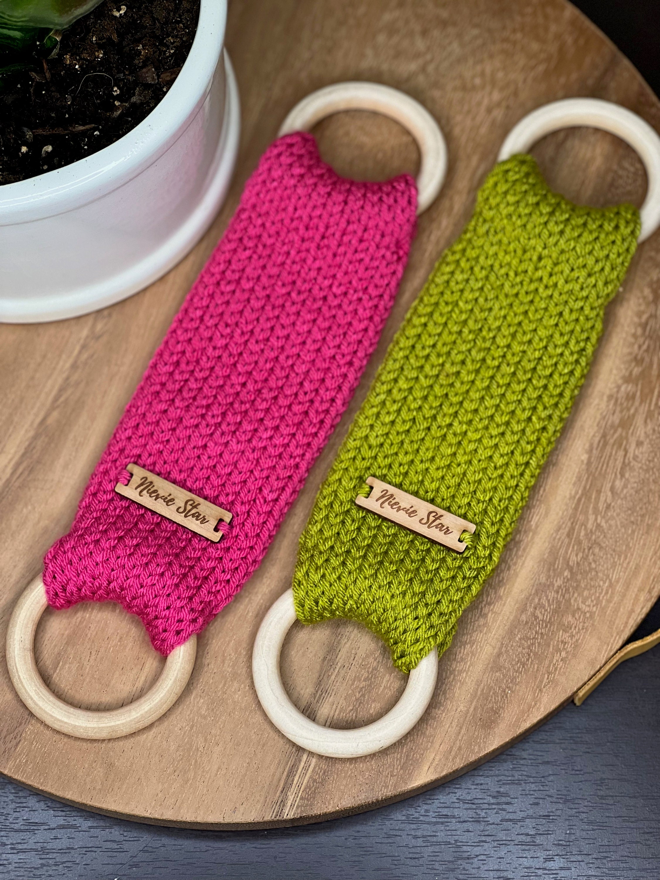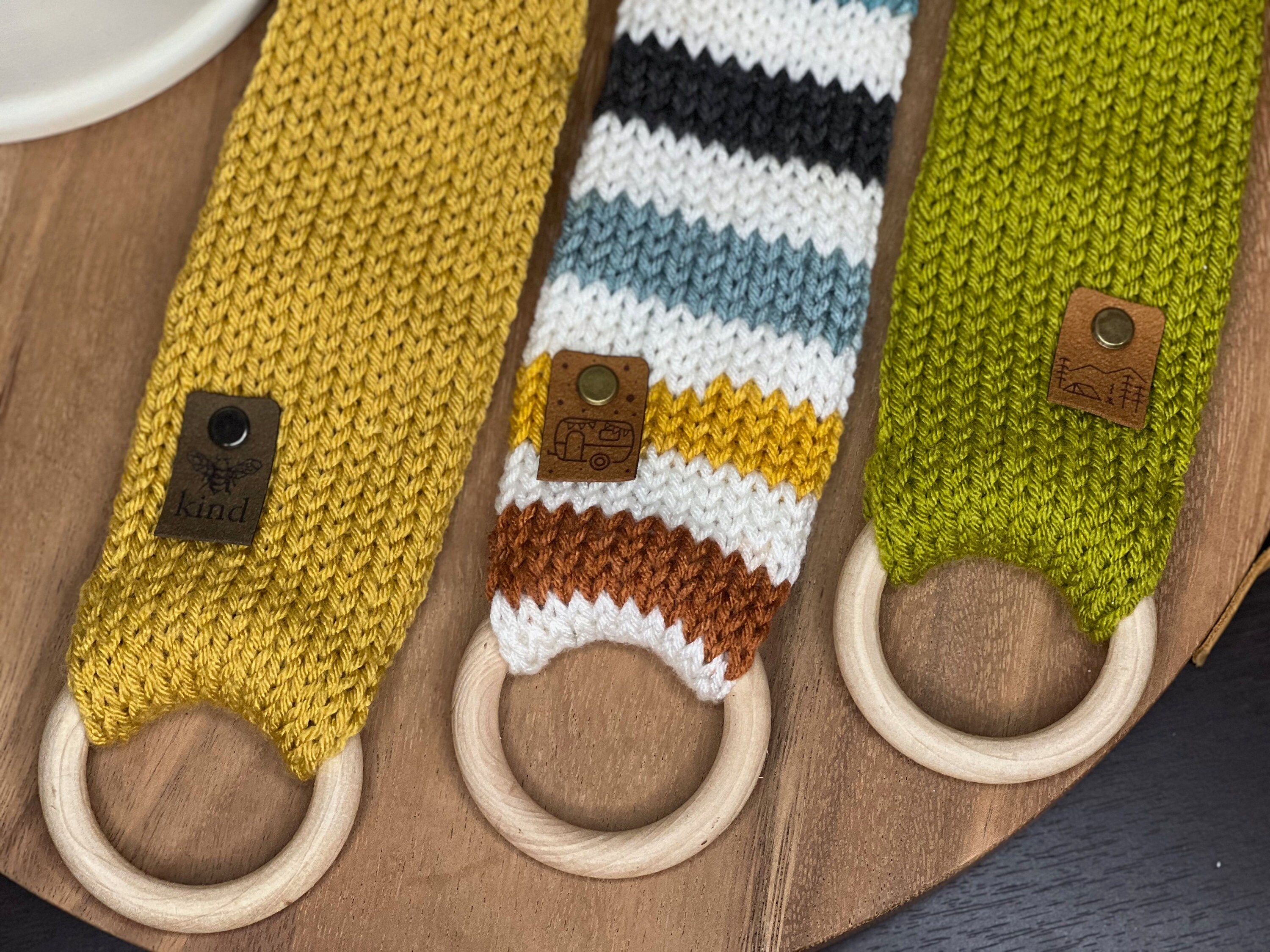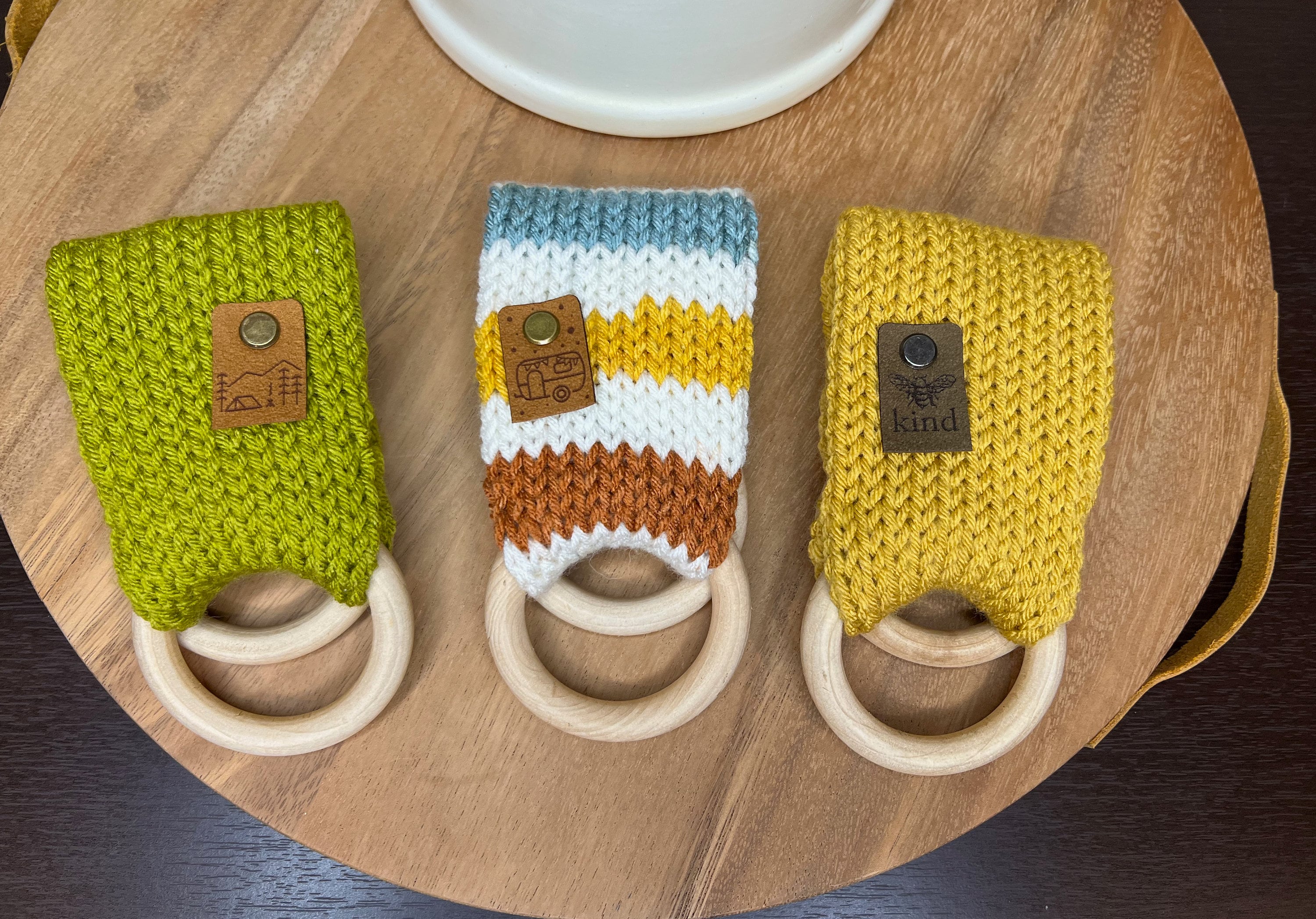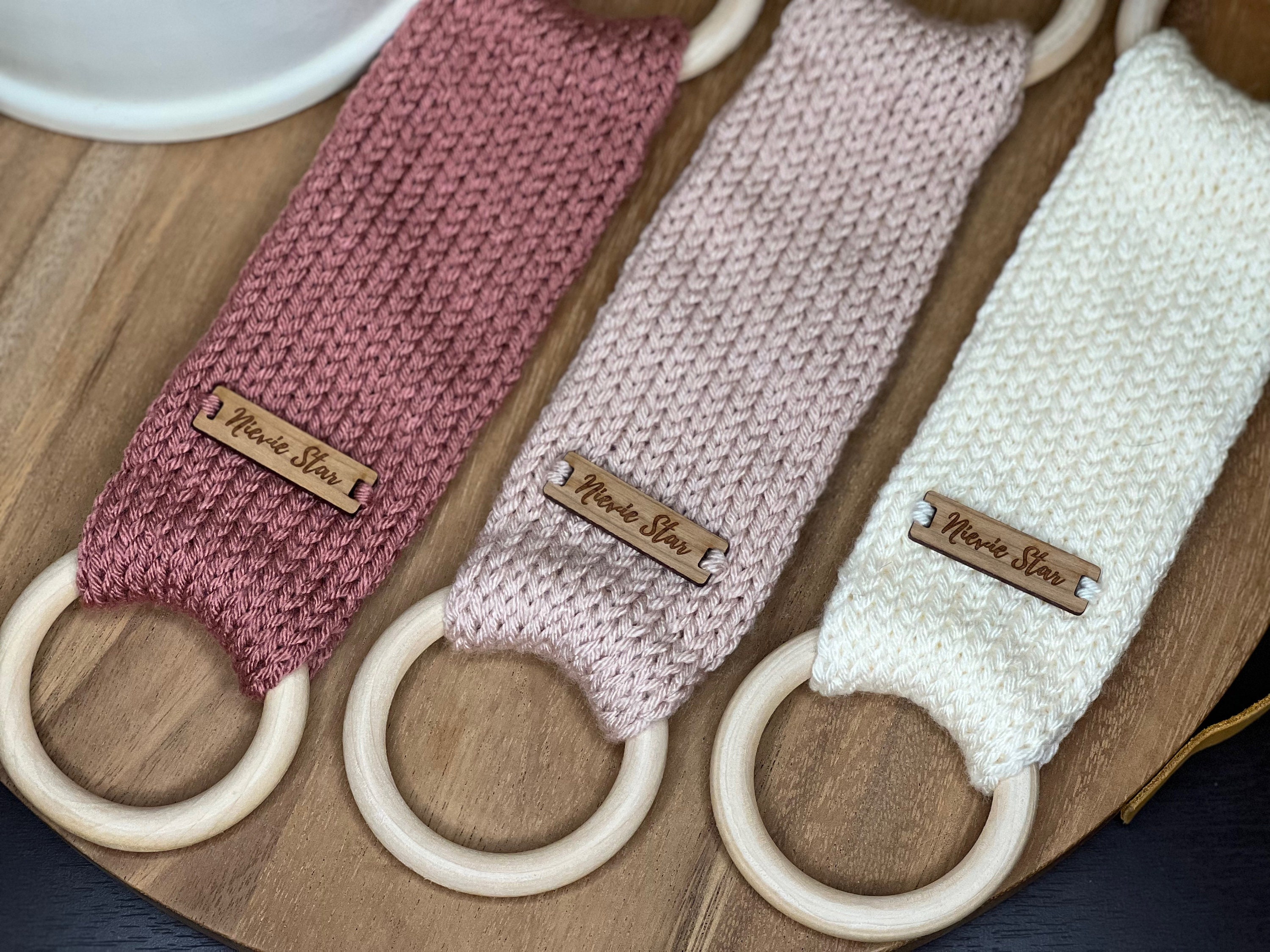 Available in multiple colors with different tags either wood or faux suede/leather. Handcrafted in 100% acrylic yarn for easy care. Approximate diameter of wooden ring: 70mm (2.75”)