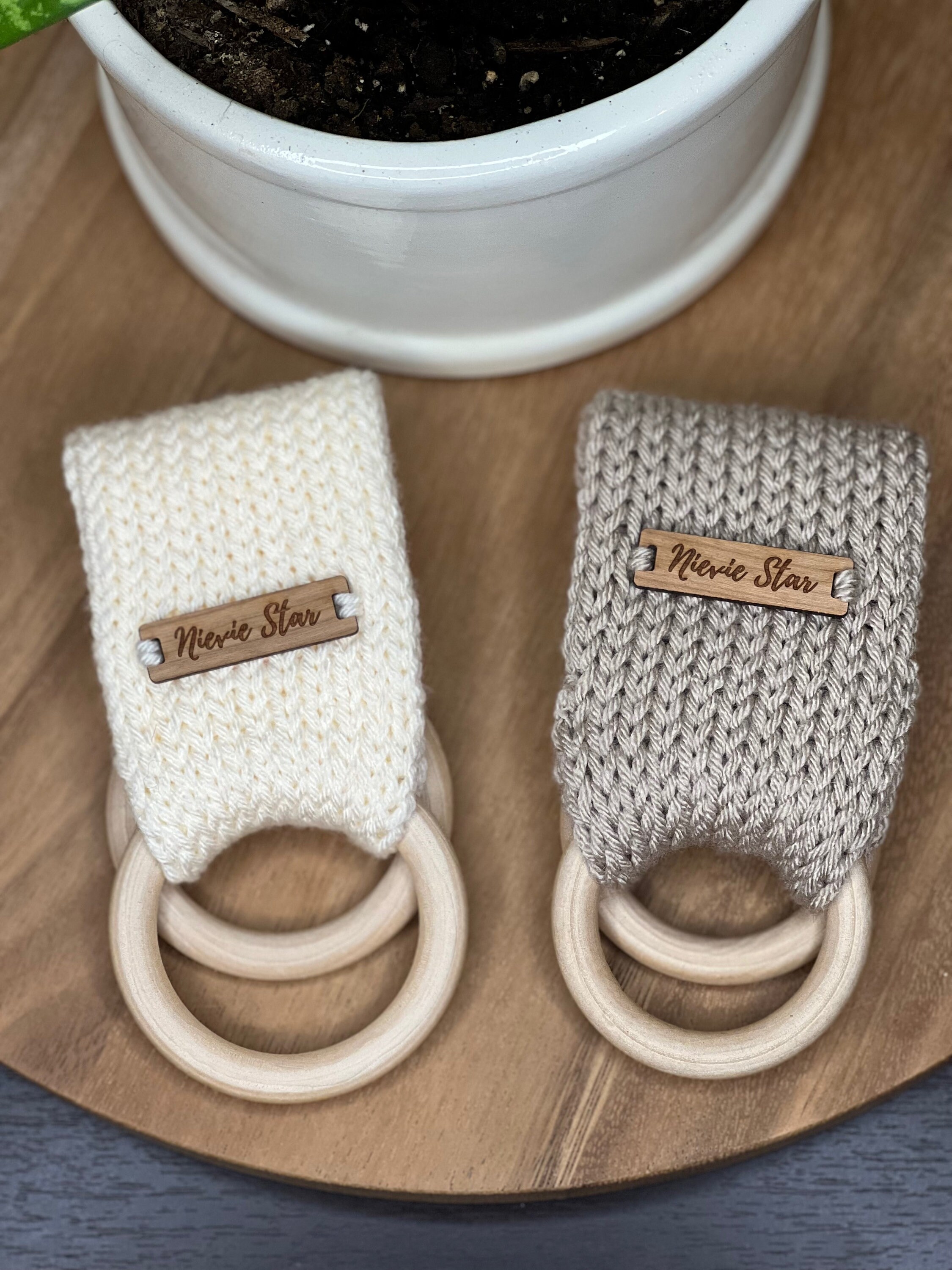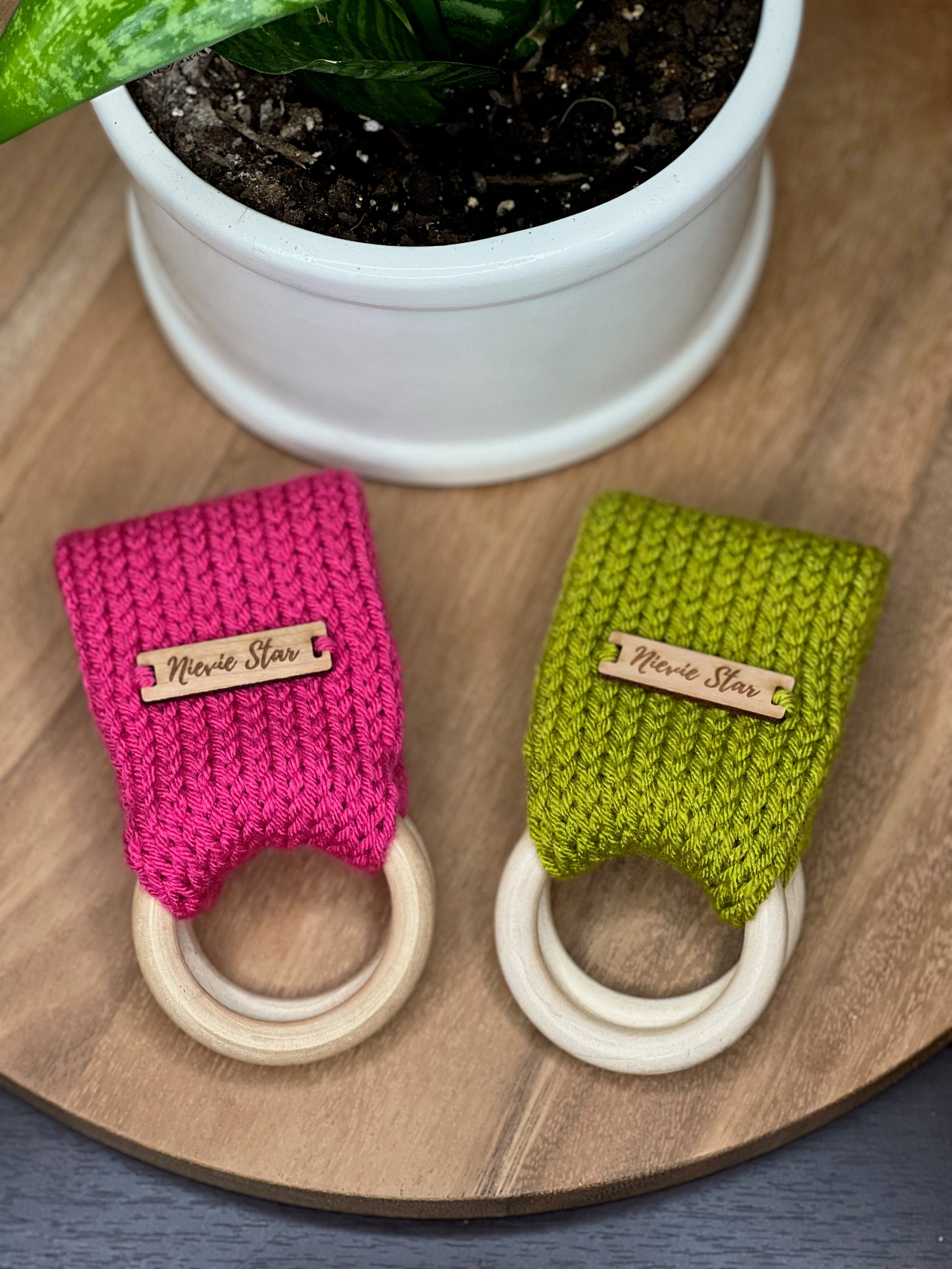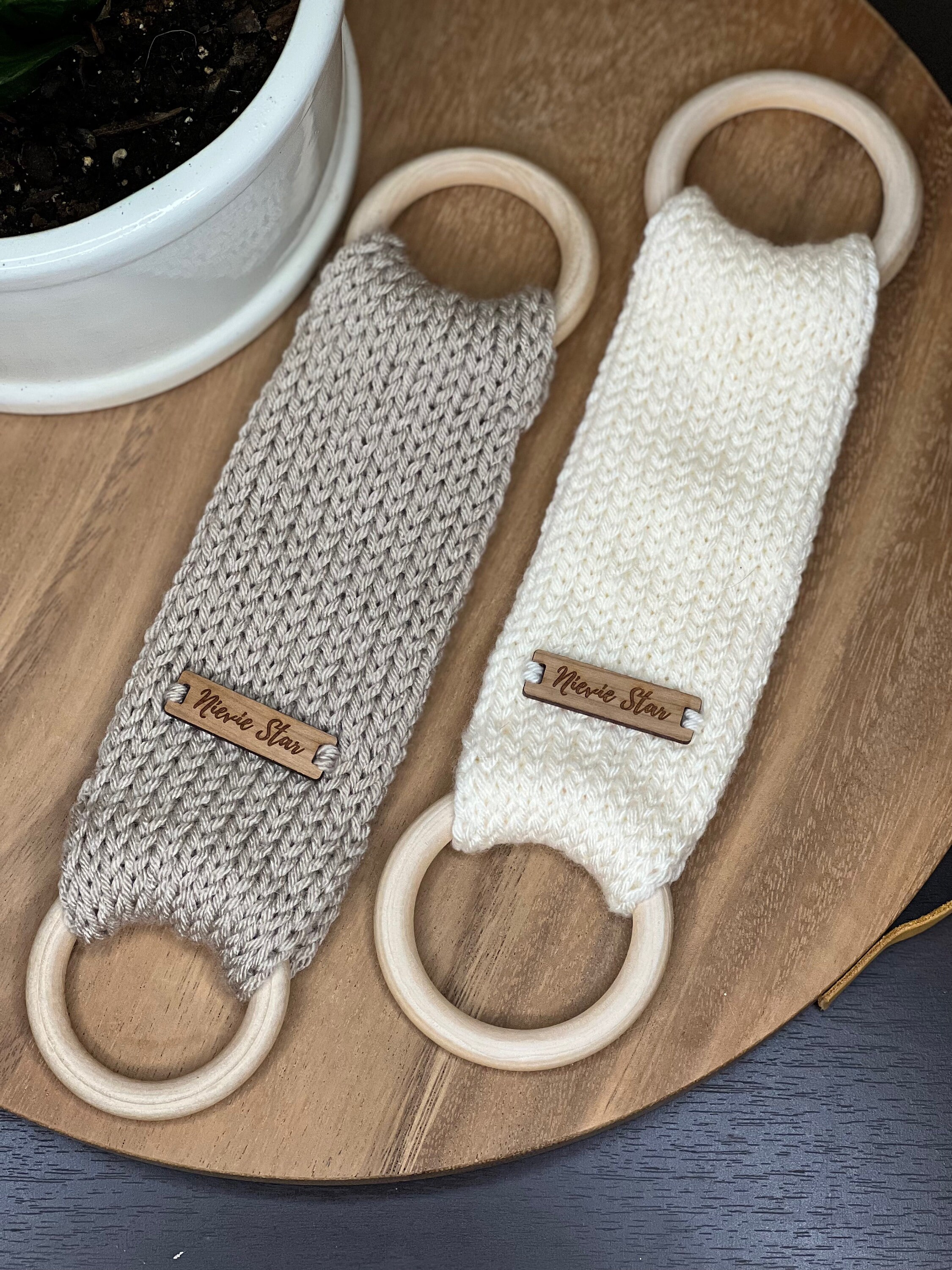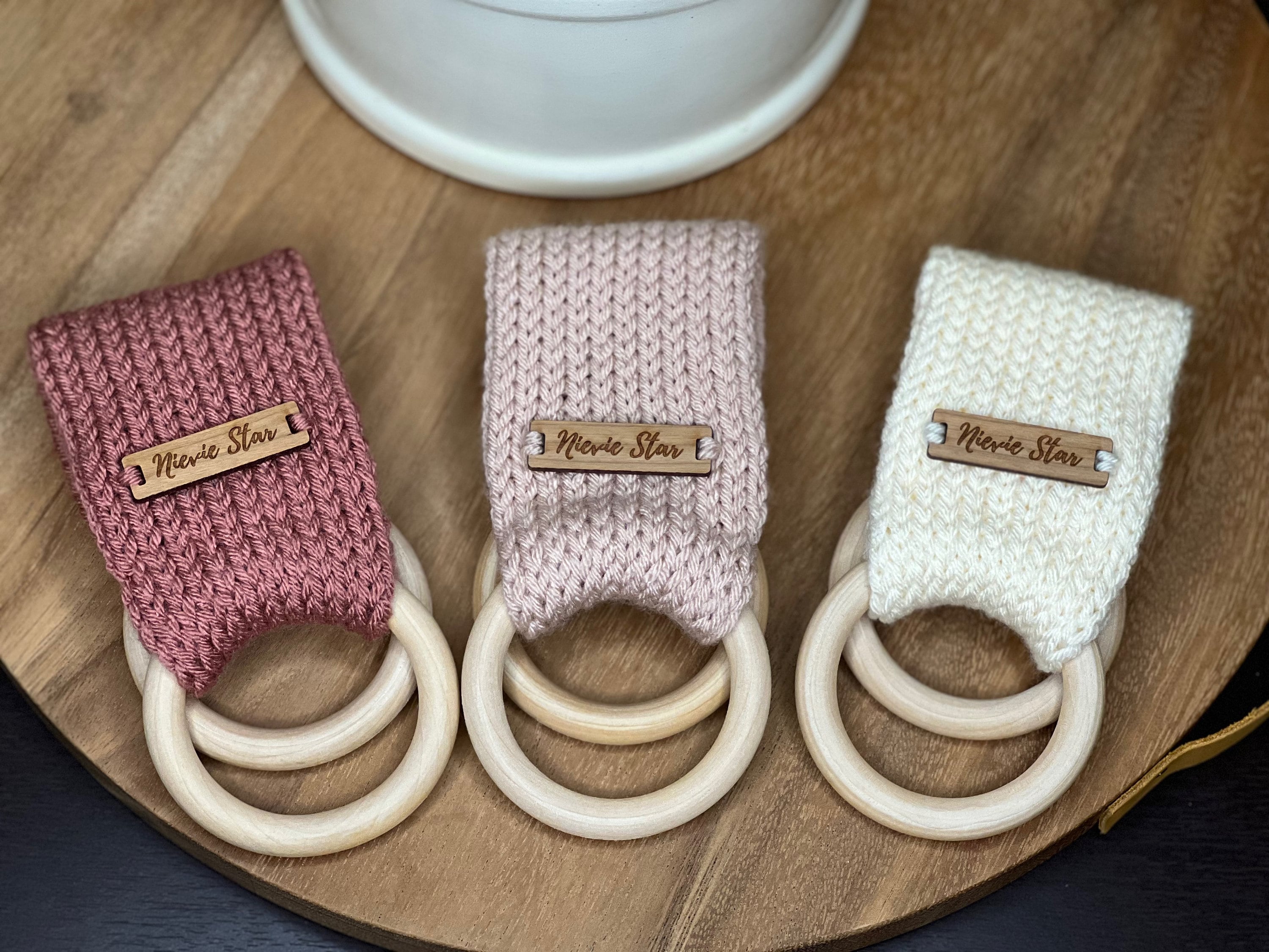 Available in multiple colors with different tags either wood or faux suede/leather. Handcrafted in 100% acrylic yarn for easy care. Approximate diameter of wooden ring: 70mm (2.75”)