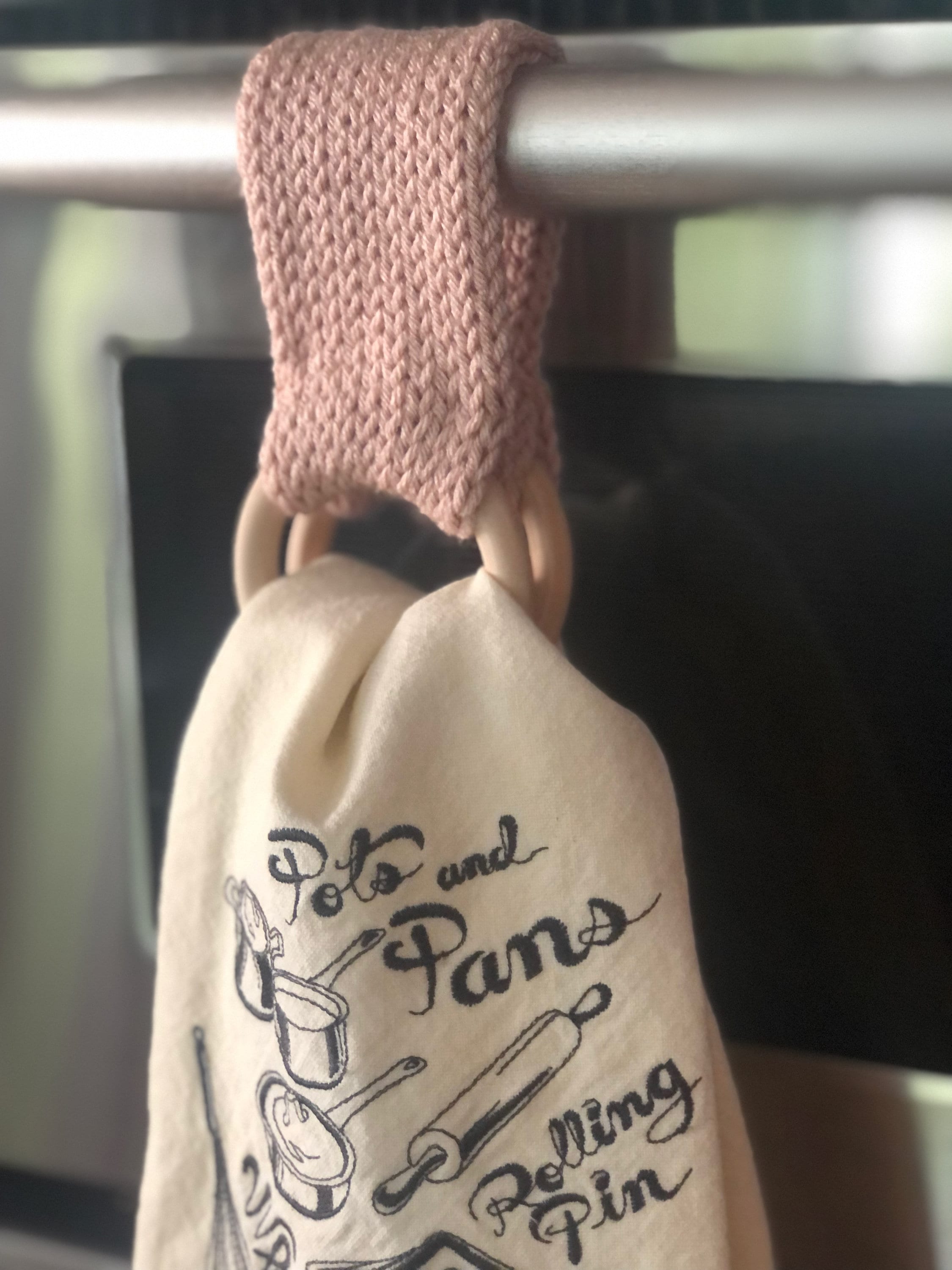 Hanging towels in your kitchen or bathroom (or anywhere you need a towel handy) is easy and stylish with these towel topper with rings. Easily hung over oven door handle, refrigerator door, dishwasher door handle, drawers or cabinets. Simply slide the rings through your appliance/drawer/door handle and place your towel through the rings.