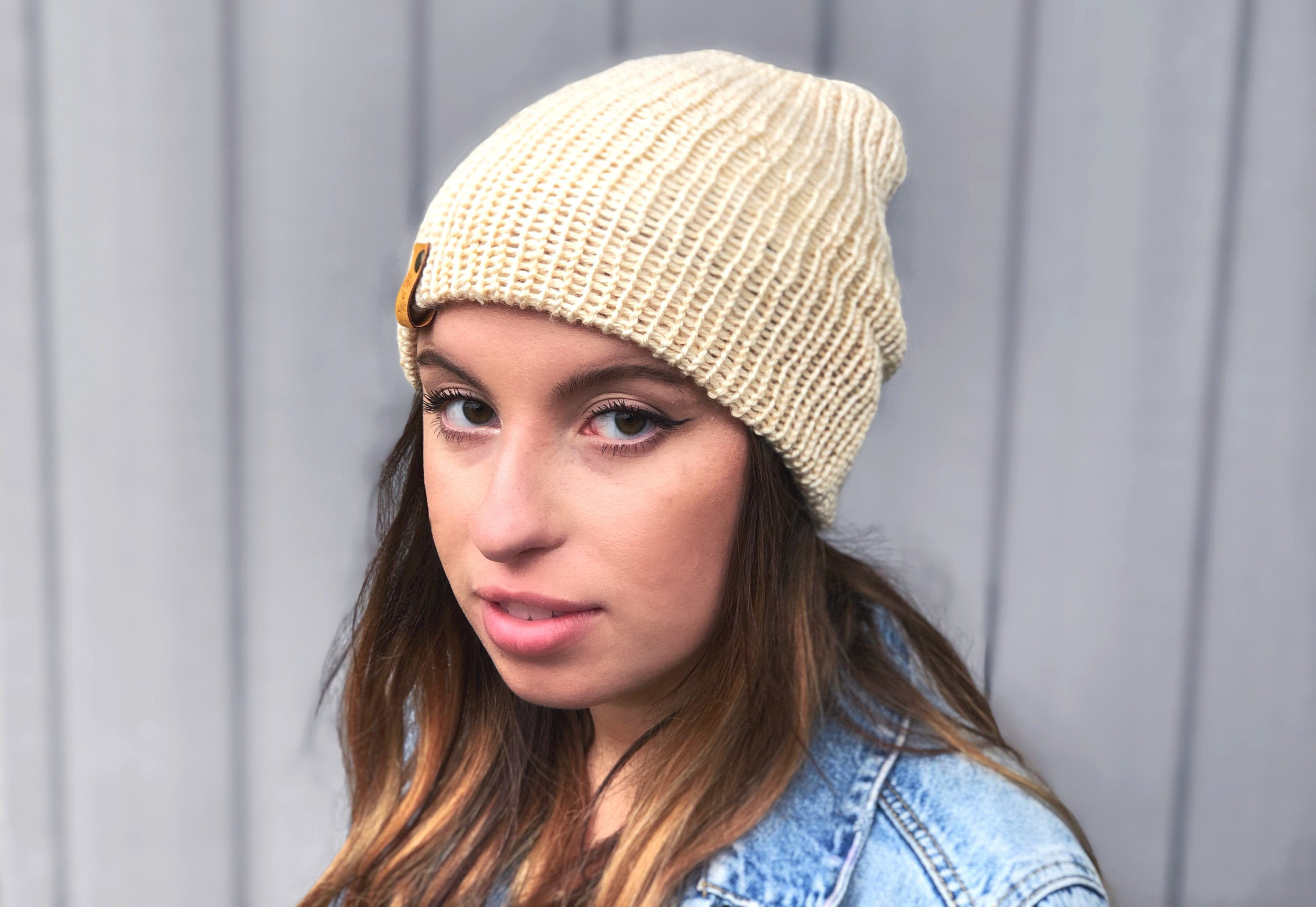 Versatile wear as a slouchy beanie or fitted beanie with brim. Made to fit an average size head with some ease to fit ~21"-24" head circumference.